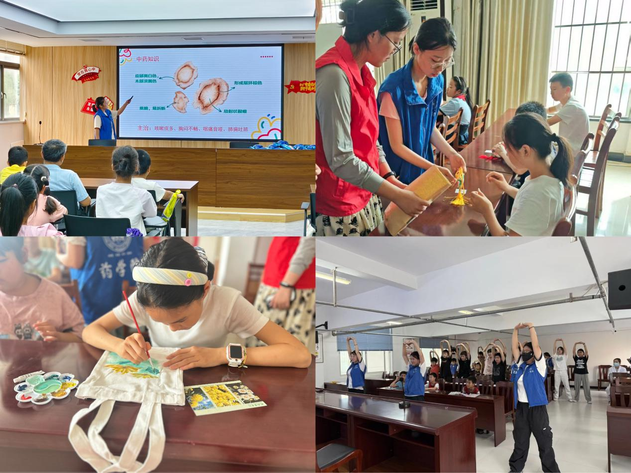 皖药科普进社区,趣味互动传文化。志愿队在儒林西苑社区、马塘书院、白马书院、教场东村社区开设“皖药小课堂”系列科普活动,围绕安徽省十大皖药,讲解药材的生长特性、药用价值及地域文化故事,还组织制作中药驱蚊香囊、“中医药帆布包绘画”等活动,让孩子们在实践中加深对中医药的认知;同时,在阜阳临泉县社会儿童服务中心,队员带领孩子们体验八段锦,让其在互动中感受中医药养生智慧,实现知识传播与文化传承的融合。