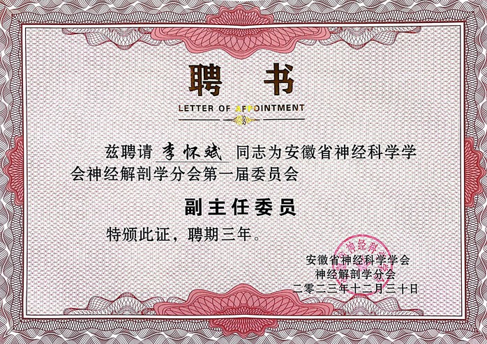 大会邀请浙江大学、复旦大学、中国科学技术大学等省内外专家就目前神经解剖学领域热点问题作精彩主题报告,推选产生了安徽省神经科学学会神经解剖学分会第一届委员会,我校继续教育学院院长、人体解剖学省级教学团队负责人李怀斌教授当选副主任委员,并主持学术报告会。