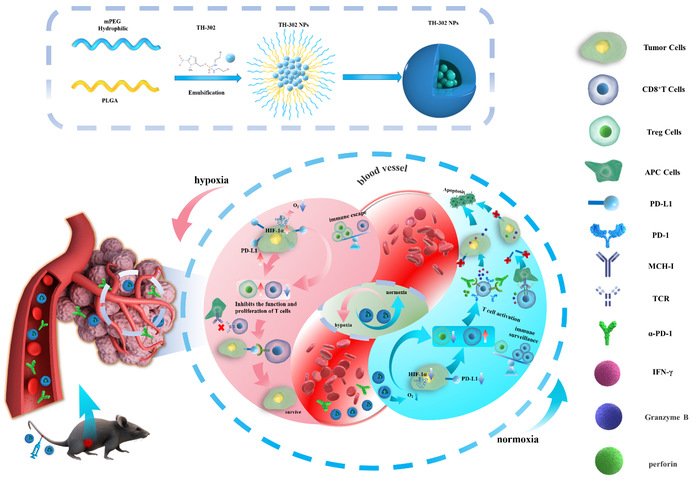 缺氧是大多数实体瘤的基本特征,可形成肿瘤免疫抑制微环境,限制PD-1抑制剂疗效。本研究设计了靶向干预肿瘤缺氧微环境的新型纳米载药系统,能够将低氧激活前药TH-302高效递送至肿瘤组织,改善胃癌组织缺氧程度,促进CD8+T细胞浸润肿瘤组织,抑制胃癌免疫逃逸,增强PD-1抑制剂治疗疗效。此外,该系统在体内还具有良好的药物缓释、肿瘤靶向和生物安全性,为胃癌缺氧-免疫联合治疗提供新策略,具有良好的临床转化前景。