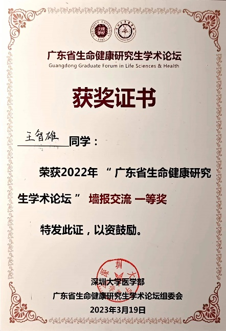 通过本项目研究,第一作者王智雄获得广东省生命健康研究生学术论坛墙报交流一等奖,获批校大学生科研课题1项,申请国家发明专利1项。