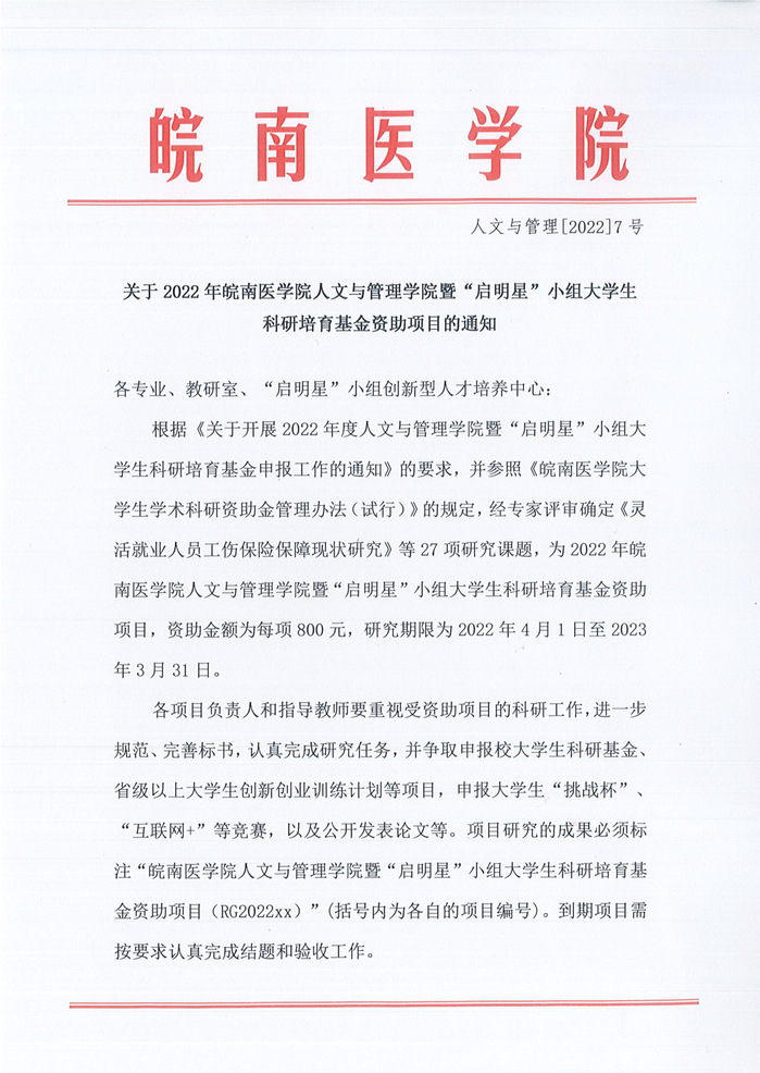 3月5日,《关于开展2022年度人文与管理学院暨“启明星”小组大学生科研培育基金申报工作的通知》(人文与管理〔2022〕3号)发布,新一期“启明星”小组成员一经建立自己的创新能力训练项目小组,即在指导教师的引导下,积极按照要求开展培育基金申报工作,共申报项目23项,成功获批21项。