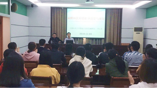 2018年11月3日下午2点,麻醉学院邀请我校优秀校友、安徽医科大学附属六安医院麻醉科副主任李仁虎在图书馆十楼视频会议室为师生做题为“麻醉科医师的职业前景与规划”的报告。麻醉学院副院长马同军、郭文俊及部分辅导员和学生参加报告会。报告会由郭文俊主持。
