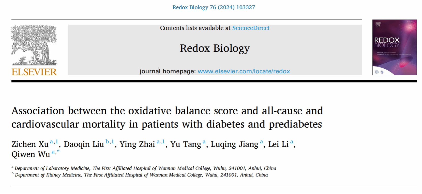 近日,检验学院临床微生物与免疫学教研室武其文教授课题组在生物学领域国际权威期刊《Redox Biology》(中科院一区TOP IF=10.7)发表题为《Association between the oxidative balance score and all-cause and cardiovascular mortality in patients with diabetes and prediabetes》学术论文。