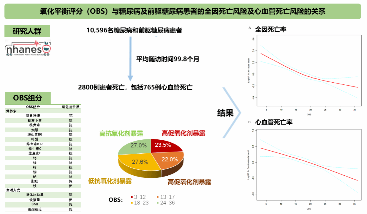 氧化应激被认为是糖尿病发生和发展的重要风险因素。尽管已有研究探讨了氧化应激与糖尿病的关系,但关于系统性氧化应激与糖尿病及糖尿病前期患者死亡风险之间的联系,仍缺乏深入的研究。氧化平衡评分(OBS)作为一种新兴的系统性氧化应激指标,通过综合考虑饮食和生活方式中的20种抗氧化剂和促氧化剂成分来计算,其高低反映了抗氧化剂暴露的程度。OBS是评估个体整体氧化/抗氧化状态的一个综合性指标,较高的OBS表示更强的抗氧化活性,而较低的 OBS 则表示更强的促氧化活性。